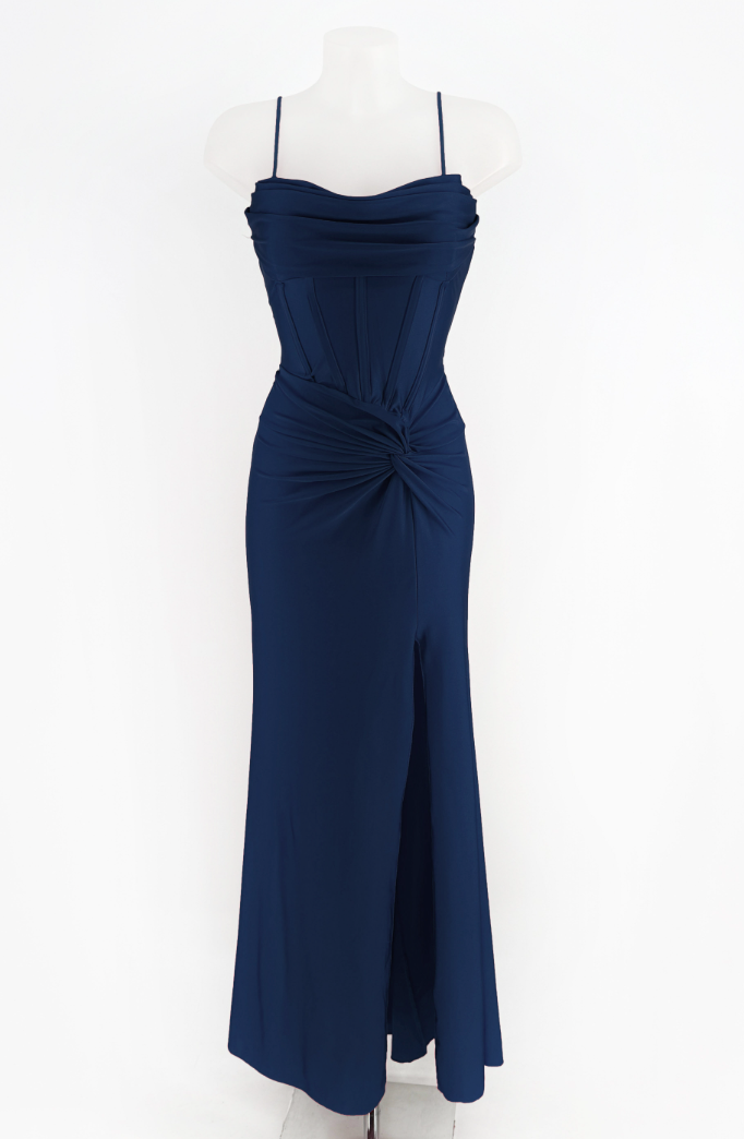 L'abito Stella unisce eleganza e sensualità grazie al suo design raffinato, caratterizzato da uno spacco laterale che valorizza la silhouette. Il dettaglio del nodino sul fianco aggiunge un tocco di originalità e grazia, rendendo questo capo ideale per occasioni formali dove si desidera distinguersi con stile e sobrietà. Realizzato con materiali di qualità, offre comfort senza rinunciare a una linea impeccabile.