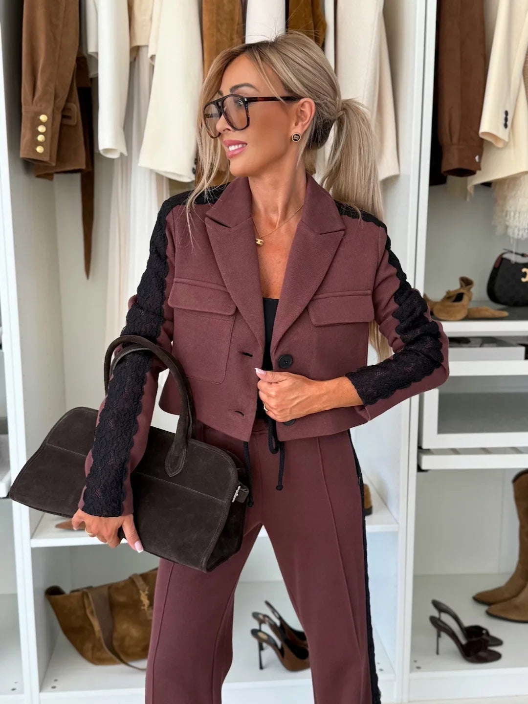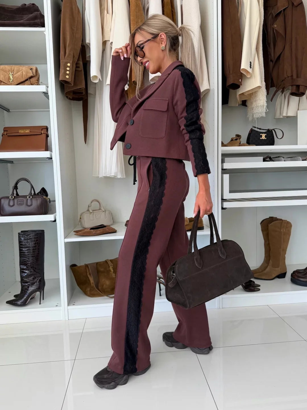 Con il Completo Bailera aggiungi al tuo guardaroba un mix perfetto di eleganza e stile moderno. La giacca dal taglio corto presenta un design distintivo con tasche sul busto, doppio bottone e dettagli a contrasto sulle spalle e maniche, per un look sofisticato ma fresco. I pantaloni, con vita elastica, strisce laterali e gambe svasate, offrono comfort e un tocco di originalità. Scegli il Completo Bailera per esprimere sicurezza e stile in ogni occasione, dal meeting importante all’uscita informale, senza rinunciare alla raffinatezza.