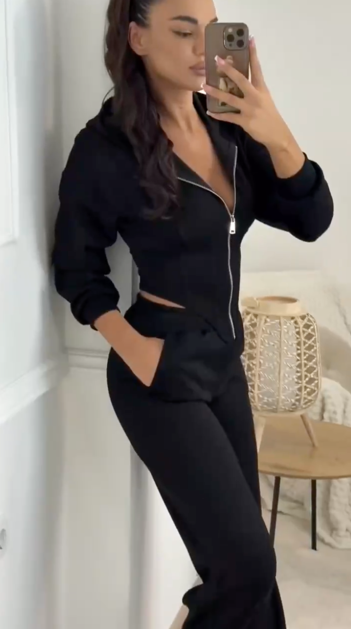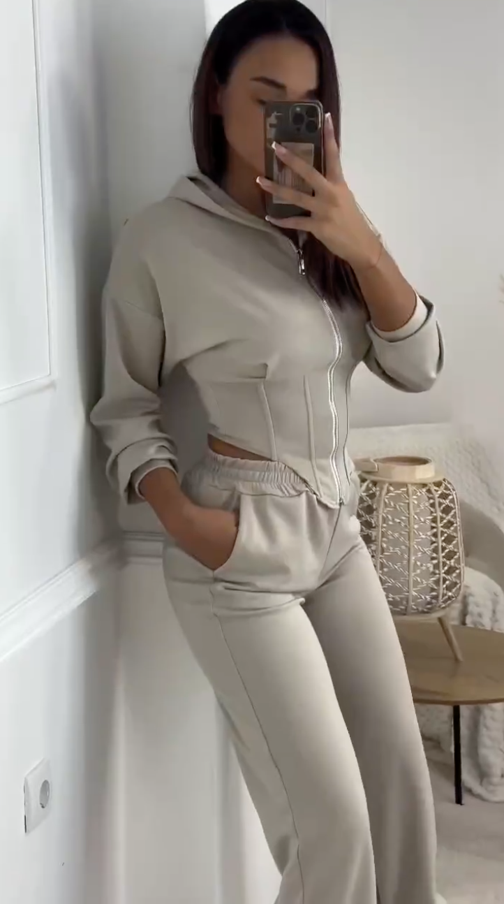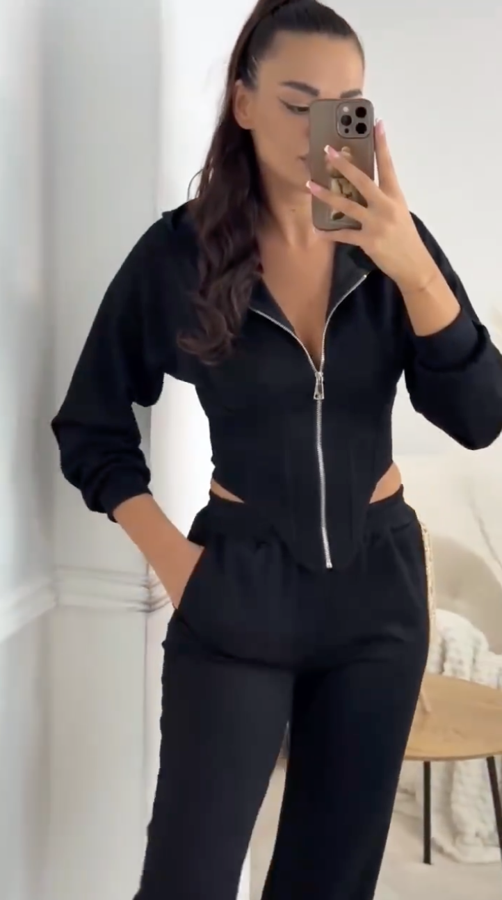 Il Completo Cristina unisce stile sportivo e funzionalità con pantalone e giacca dotati di chiusura zip. Progettato per garantire comfort e praticità, è ideale per chi cerca un look contemporaneo senza rinunciare alla versatilità quotidiana. Perfetto per un outfit dinamico e alla moda.