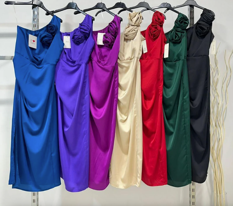 Vestito Giordana è un abito monospalla raffinato realizzato in tessuto effetto raso, che dona un elegante gioco di luci e morbidezza al tatto. La decorazione a forma di rosa aggiunge un tocco distintivo e sofisticato, perfetto per chi cerca uno stile alla moda senza rinunciare alla classe. Ideale per occasioni speciali, questo vestito valorizza la silhouette con un design contemporaneo e femminile.