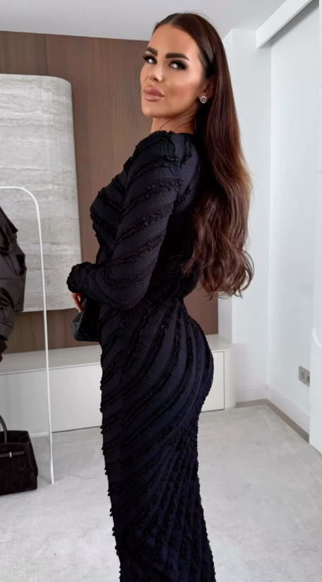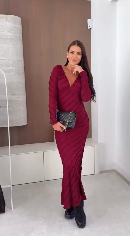 Vestito Sally combina eleganza e comfort, ideale per l'autunno. Il design con scollo a V valorizza la linea del collo, mentre le maniche lunghe offrono una copertura raffinata adatta alle giornate fresche. Questo vestito versatile si adatta perfettamente a occasioni formali o a momenti più informali, garantendo uno stile sofisticato senza rinunciare alla praticità.
